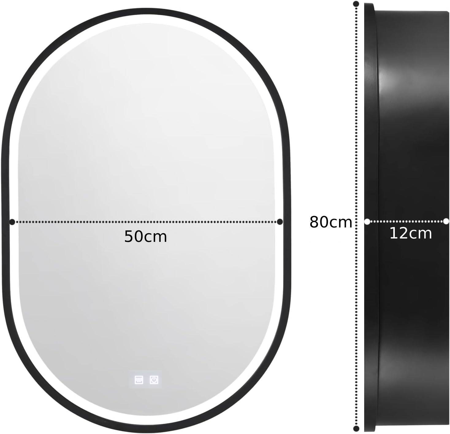 Καθρέφτης LED με Ντουλάπι, Οβάλ, 50x80cm, Demist, Κρύο/Ζεστό/Ουδέτερο φως, Μαύρο πλαίσιο, Αποθηκευτικός χώρος