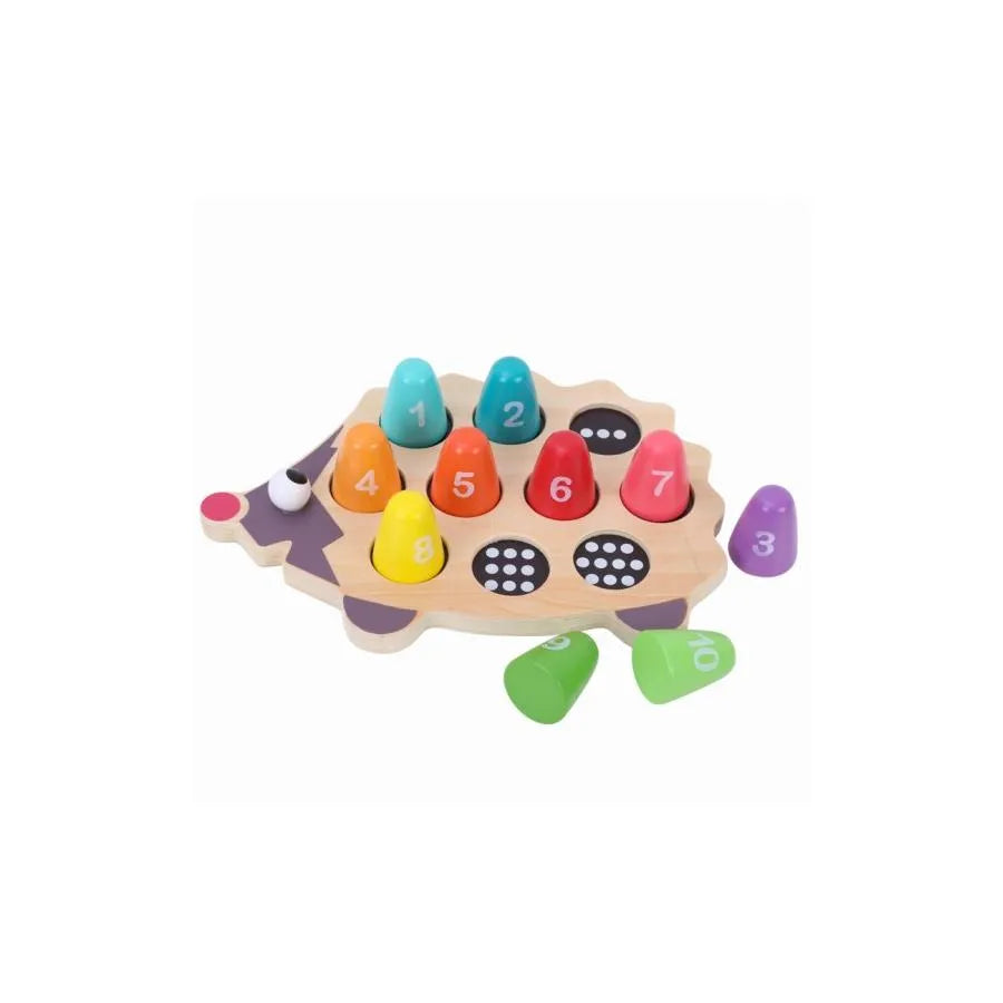 Το ξύλινο σκαντζόχοιρο είναι όμορφα χρωματισμένο και έχει 10 πιόνια, τα οποία ταιριάζουν στις περικοπές στο σώμα του σκαντζόχοιρου. Κάθε πιόνι έχει κάτω από αυτό μια γραφική αναπαράσταση ενός ψηφίου μέσω των σημείων. Για παράδειγμα, το σχήμα 5 θα αντιπροσωπεύεται από 5 βαθμούς.