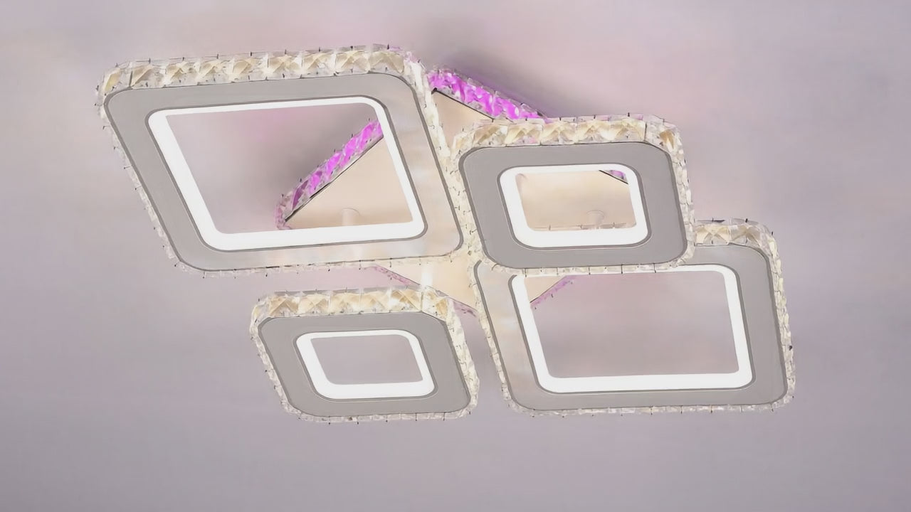 Τα τέσσερα λευκά τετράγωνα, διακοσμημένα με κρύσταλλα, δημιουργούν μια κομψή και φωτεινή γεωμετρική εμφάνιση. Οι κρύσταλλοι θα αντανακλούν και θα διαθλούν το ενσωματωμένο φως LED, δημιουργώντας ένα αστραφτερό αποτέλεσμα και μια εκλεπτυσμένη ατμόσφαιρα. Το συμπεριλαμβανόμενο τηλεχειριστήριο σάς δίνει τον έλεγχο όχι μόνο της θερμοκρασίας χρώματος (ψυχρό, ζεστό ή ουδέτερο) και της έντασης φωτός (με δυνατότητα ρύθμισης της έντασης), αλλά και της λειτουργίας RGB, που σας επιτρέπει να επιλέξετε από μια μεγάλη γκάμα χρωμάτων για να δημιουργήσετε εξατομικευμένα και ζωντανά εφέ φωτισμού.