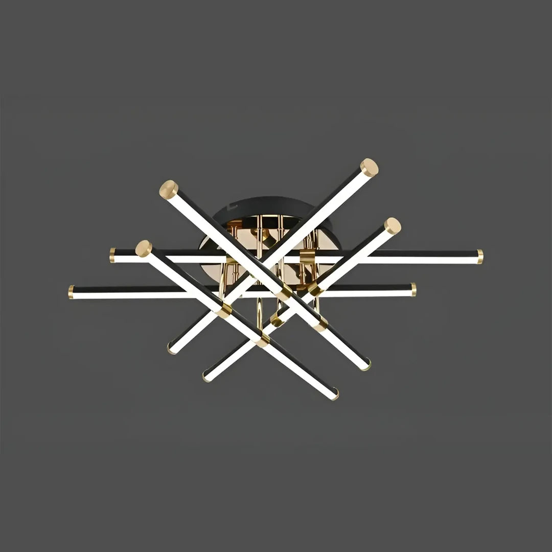 Τα έξι στοιχεία, το σχήμα των οποίων δεν προσδιορίζεται, φωτίζονται από LED με δυνατότητα επιλογής της θερμοκρασίας χρώματος. Μέσω του τηλεχειριστηρίου, μπορείτε να επιλέξετε ανάμεσα σε κρύο, ζεστό ή ουδέτερο φως και μπορείτε να ρυθμίσετε την ένταση του φωτός χάρη στη λειτουργία dimming. Ο συνδυασμός μαύρου και γυαλιστερού χρυσού προσθέτει μια εκλεπτυσμένη αντίθεση και μια πινελιά πολυτέλειας στο σχέδιο. Με ισχύ 144W είναι ιδανικό για φωτισμό μεγάλων σαλονιών, τραπεζαριών ή άλλων μεγάλων χώρων.