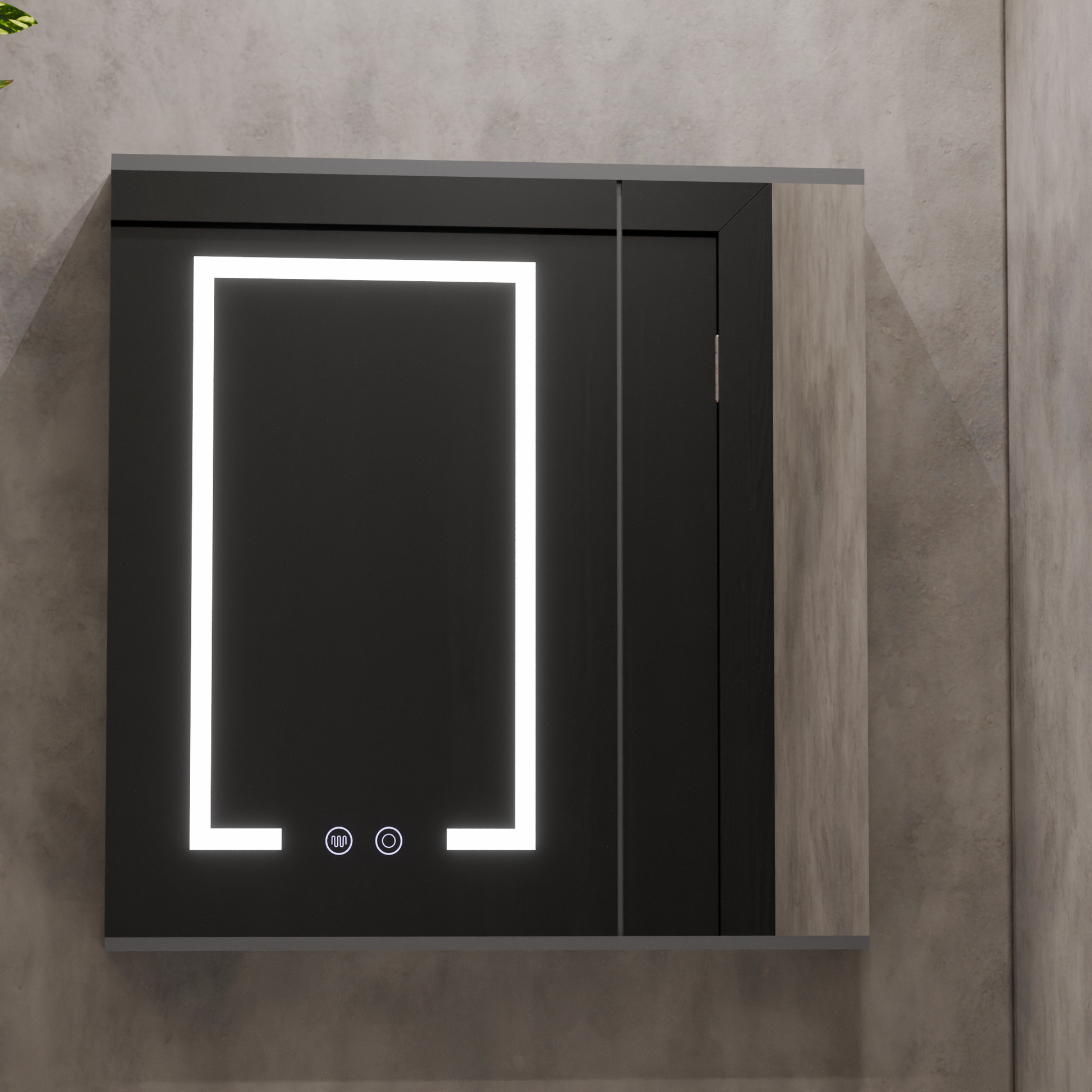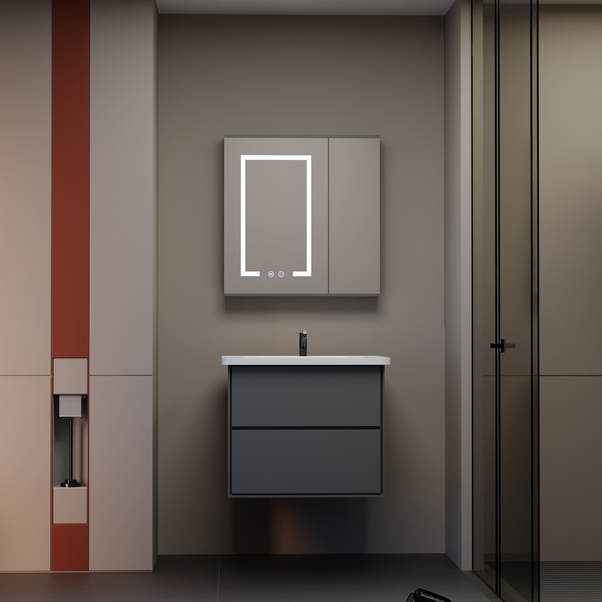 1. Επάνω σώμα (Έπιπλα με καθρέφτη LED): Αυτό είναι ένα κρεμαστό ντουλάπι που περιλαμβάνει έναν καθρέφτη στο μπροστινό μέρος. Το σύστημα φωτισμού LED είναι ενσωματωμένο στο περίγραμμα του καθρέφτη και προβάλλει το φως έξω, συμβάλλοντας στη γενική ατμόσφαιρα του μπάνιου. Πίσω από τον καθρέφτη υπάρχει αποθηκευτικός χώρος για την οργάνωση καλλυντικών και προϊόντων υγιεινής.