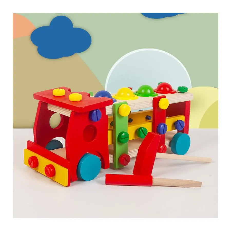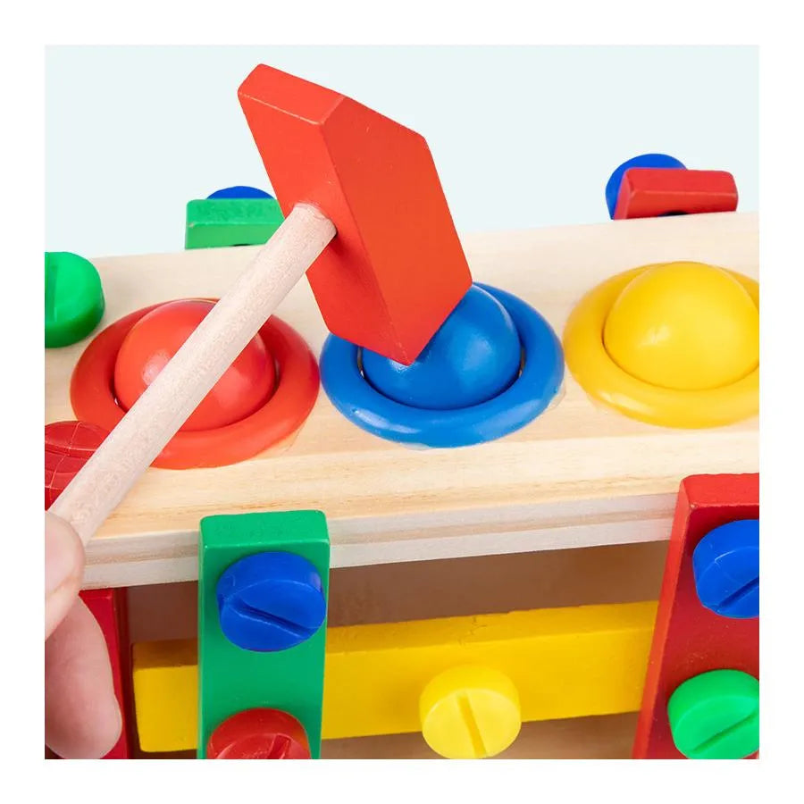 2. Εργαλεία ξύλου: Το σετ περιλαμβάνει καρφιά, σφυρί και κλειδί, όλα από ξύλο, κατάλληλο για μικρά χέρια παιδιών. Αυτά τα εργαλεία βοηθούν τα μικρά να αναπτύξουν τις δεξιότητες και το συντονισμό τους.