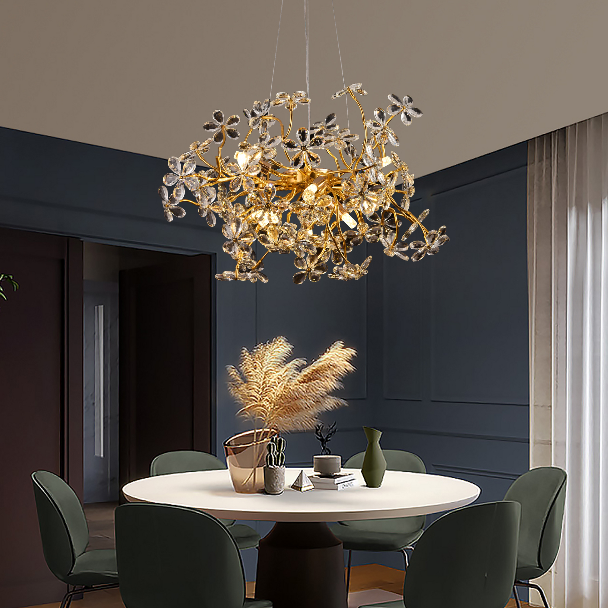 Ο κρυστάλλινος πολυέλαιος CM325/800GD είναι ένα κομψό φωτιστικό με μοντέρνο σχεδιασμό και πολυτελείς πινελιές, ιδανικό για εκλεπτυσμένους εσωτερικούς χώρους. Εξοπλισμένο με 12 πρίζες G9, παρέχει αποτελεσματικό και ομοιόμορφο φωτισμό, κατάλληλο για σαλόνια, τραπεζαρίες ή εξελιγμένους διαδρόμους.