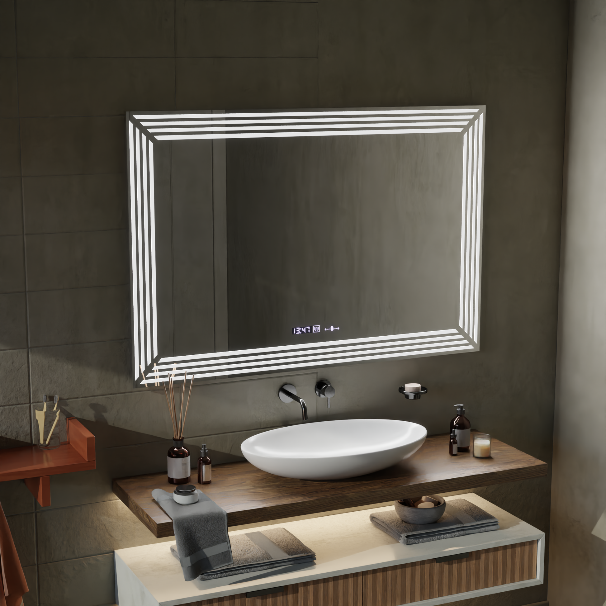 Ορθογώνιος καθρέφτης LED 60x80 cm VENEZIA – MotionGlow Marcello συνδυάζει το εκ νέου ερμηνευμένο κλασικό στυλ με τη μοντέρνα λειτουργικότητα. Ο ρυθμιζόμενος φωτισμός LED παρέχει ένα ευχάριστο φως, προσαρμόσιμο σε οποιαδήποτε ώρα της ημέρας και ο αισθητήρας εγγύτητας επιτρέπει τη διαισθητική χρήση. Το σύστημα αποθάμπωσης, το ψηφιακό ρολόι και το θερμόμετρο συμπληρώνουν αυτόν τον καθρέφτη με πρόσθετη άνεση και αποτελεσματικότητα, ιδανικό για σύγχρονα μπάνια.