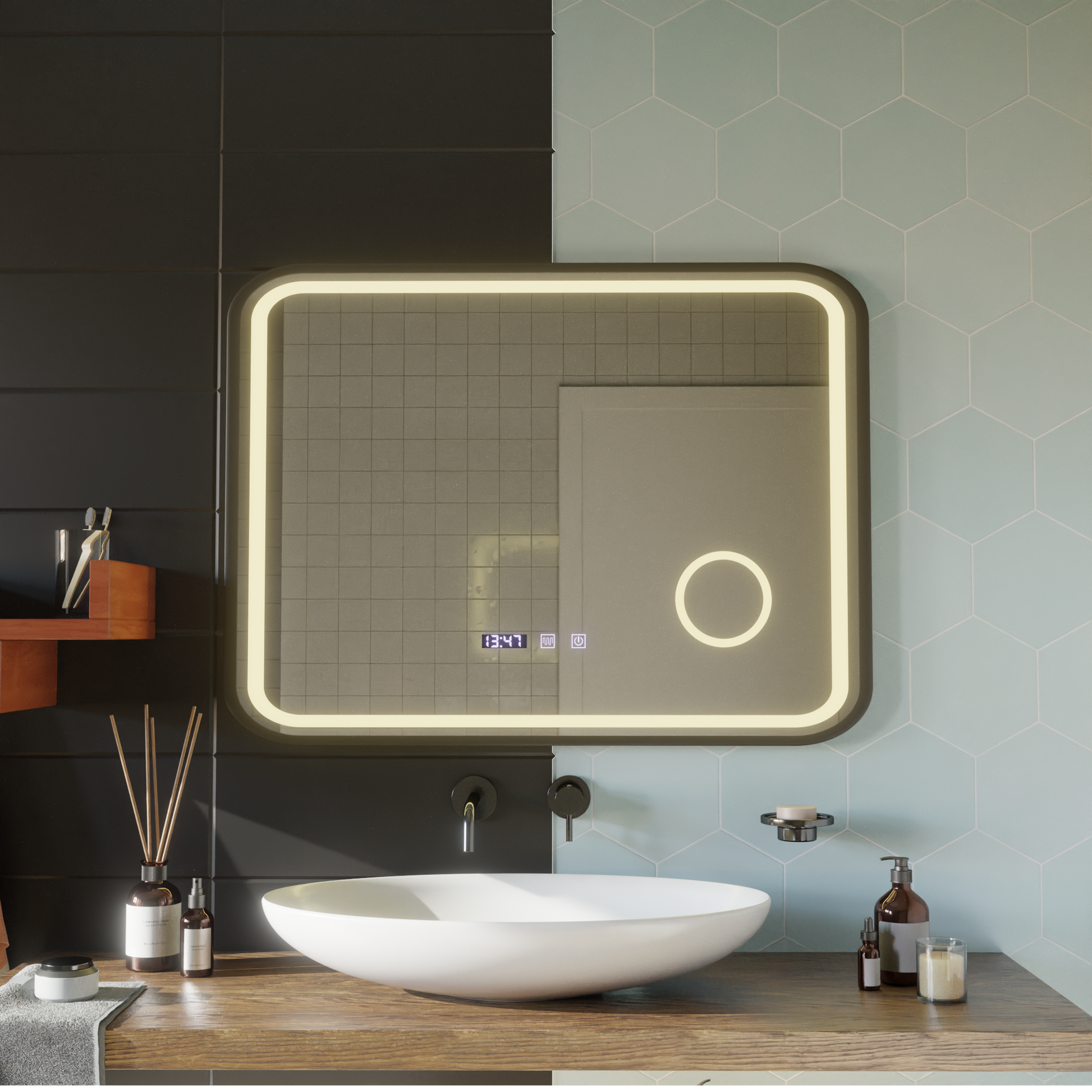 Ορθογώνιος καθρέφτης LED, 80x60cm, Eclat MotionGlow Marcello, Σύστημα Demister, Ρολόι & Θερμόμετρο, Καλλυντικός Μεγεθυντικός φακός, Ρυθμιζόμενος