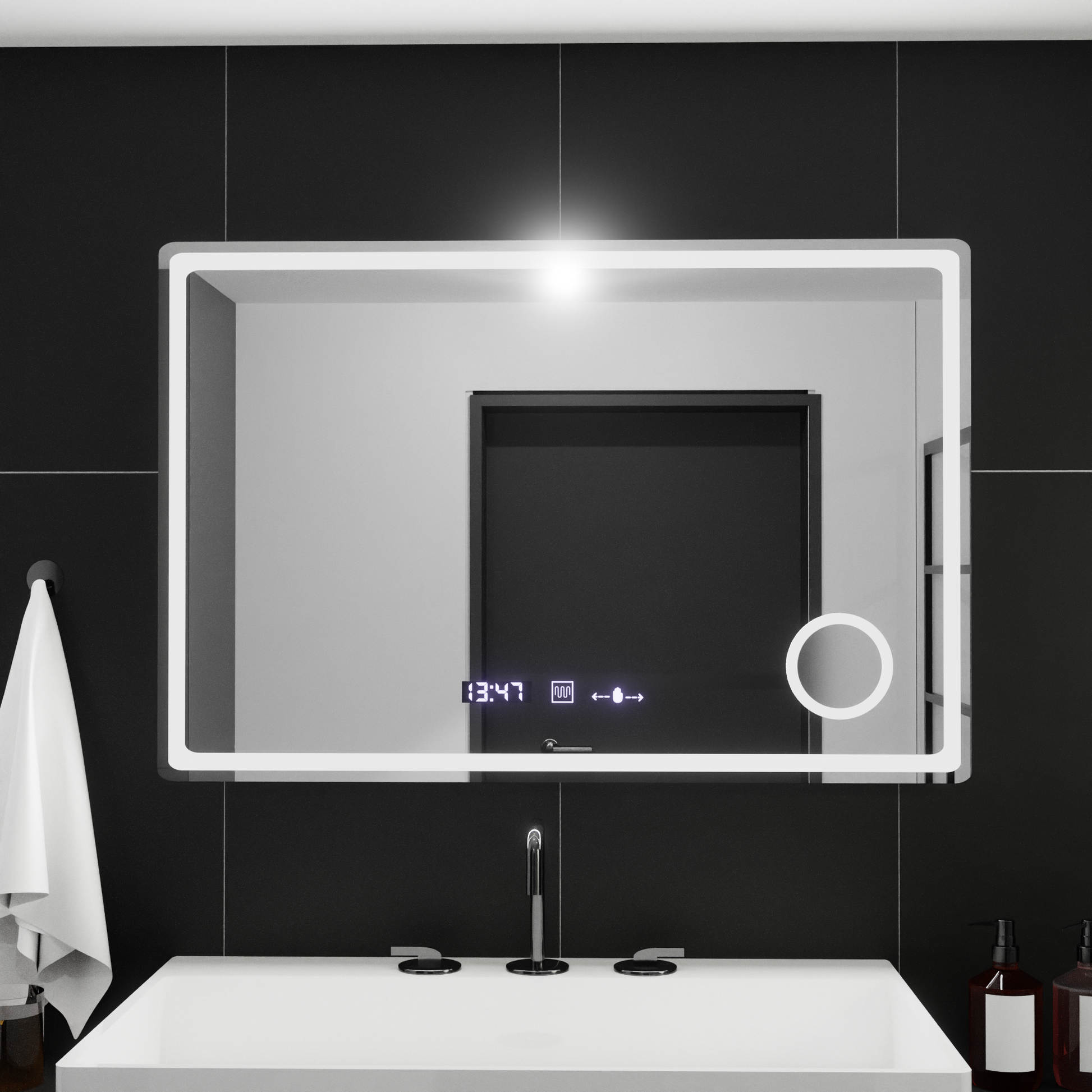 Ορθογώνιος καθρέφτης LED, 90x60 cm, Velor MotionGlow Marcello, Σύστημα Demister, Ρολόι & Θερμόμετρο, Καλλυντικός Μεγεθυντικός φακός, Ρυθμιζόμενος